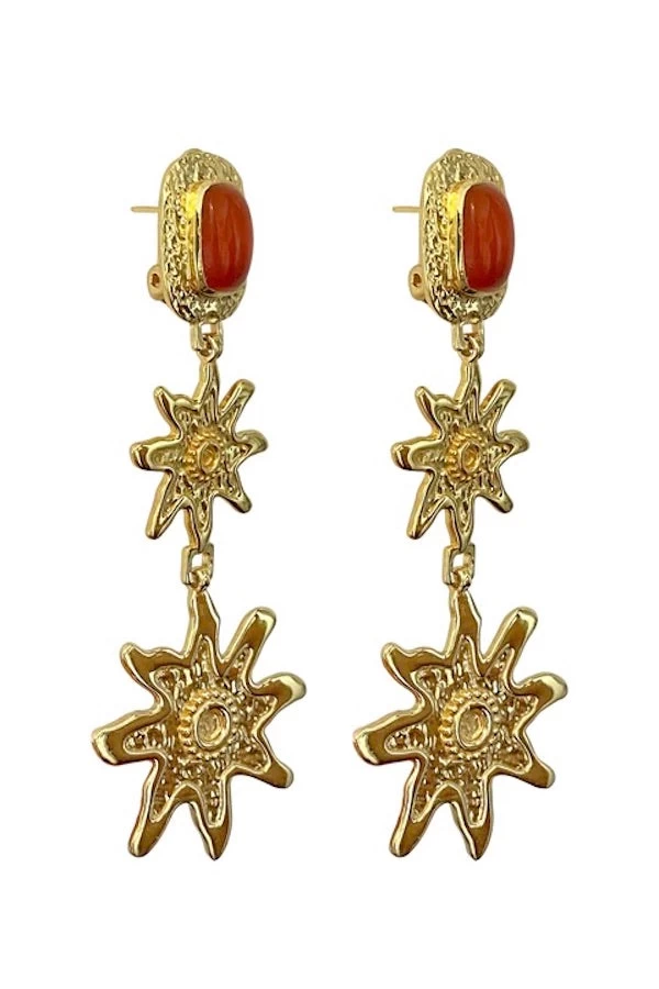 Make a stunning statement with the iconic Allegra earrings! Crafted in hammered gold with a vintage inspired double star motif, this new style is sure to be the absolute star of the show. The gorgeous Allegra earrings feature a bold Red Onyx cabochon stone with hand finished bezel in our signature texture.