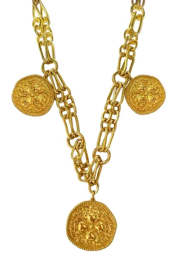 Step up your chain game with the striking Amalita Necklace. An absolute show stopper of a style, Amalita features an intricately crafted and unique double chain detail with three hammered coin medallions. This dynamic piece will take your jewellery style to the next level, as a singular statement necklace or layered with additional gold chains to complete the look. This is a longer style that we adore with a low neckline, or you can use the lobster clasp to fasten at any point and wear at whichever length you prefer.