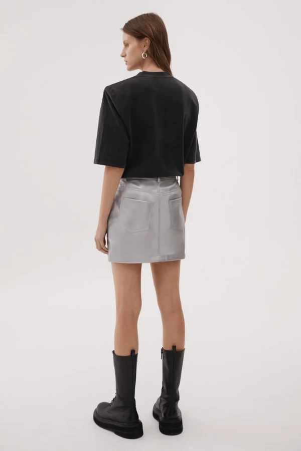 Introducing the Misha Andree PU Mini Skirt in Silver. Fun moments are spent in Andree. Giving off Y2K energy, curated in a metallic silver vegan leather fabrication, this micro mini features silver metal buttons and rivets, along with pocket detailing at the front and back. Continue the coolness by throwing on your favorite low-top suede sneakers and a classic cotton t-shirt, before running off to meet up with all of your favorite people.