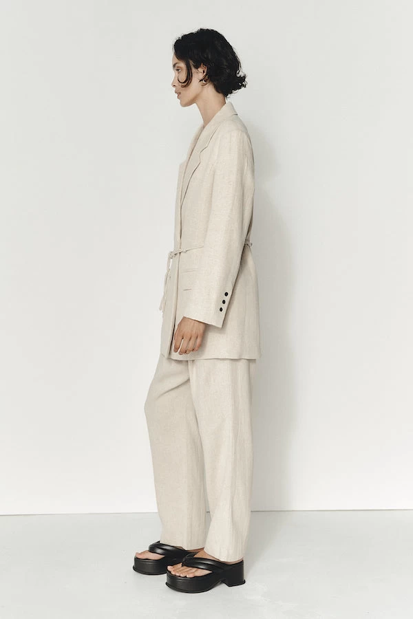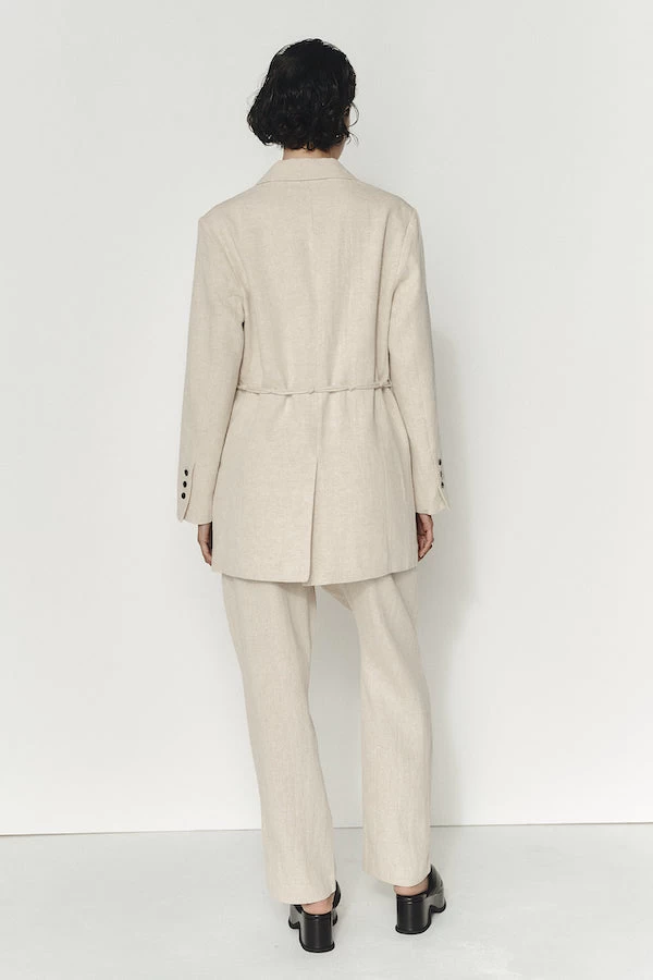 The Arlo Jacket is our take on the classic double-breasted blazer and features a slightly oversized silhouette, classic lapel collar and two pockets at the front. This blazer has an elongated silhouette, falling at a flattering length and long sleeves finished with three shell buttons. This jacket is secured by two shell buttons at the centre front and a matching detachable belt with knotted detailing. This version of the Arlo jacket is crafted in a heavy weight 100% linen.