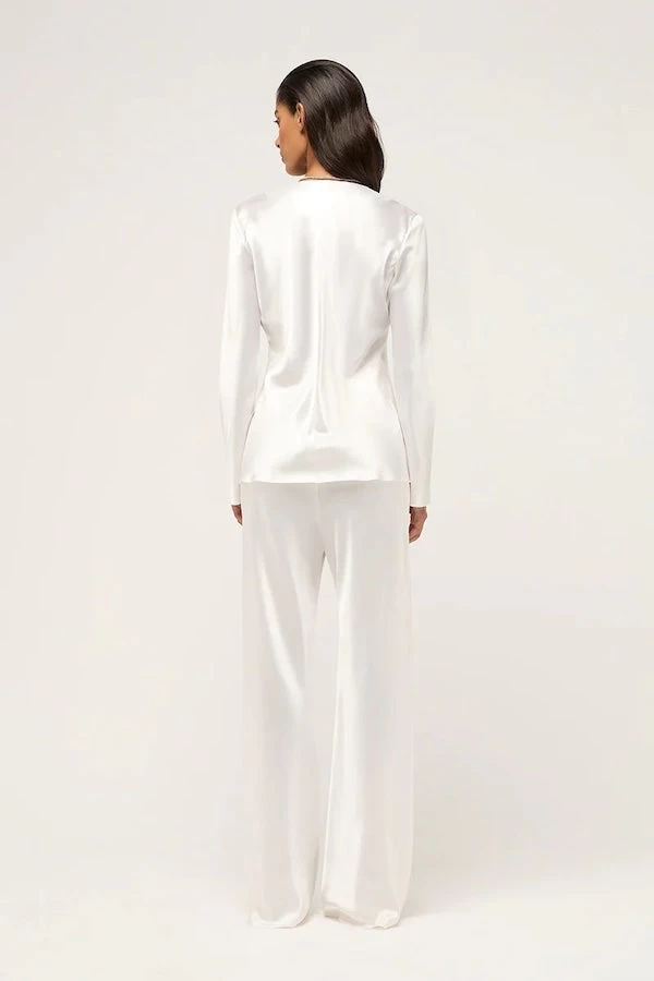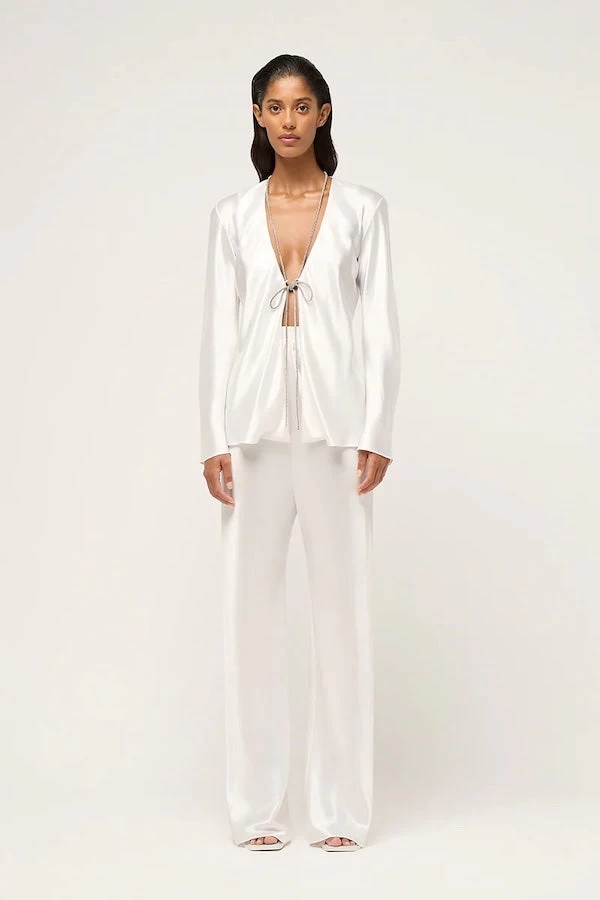Michael Lo Sordo’s Bias lounge shirt with crystal trim. Crafted from silk satin, creating a soft and sumptuous feel against the skin. The bias cut creates a flattering silhouette against the body, while the crystal trim that ties at the front adds a touch of glamour and sophistication that is sure to turn heads.Â