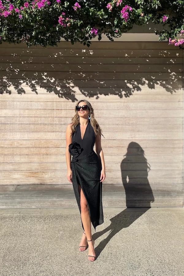 Maygel Coronel Cefeida One Piece Black. One-piece swimsuit with a halter silhouette and an open back, embellished with an oversized 3D floral detail.