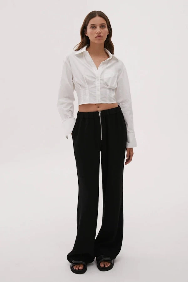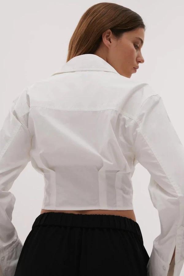 Meet Dorielle, you new everyday classic white shirt. Curated in a cropped boxy shape silhouette, this shirt features a centre button opening and tucks at the front and back hem. Style Dorielle back with a wide legged pant and sneakers, for the ultimate high-low street style inspired look.