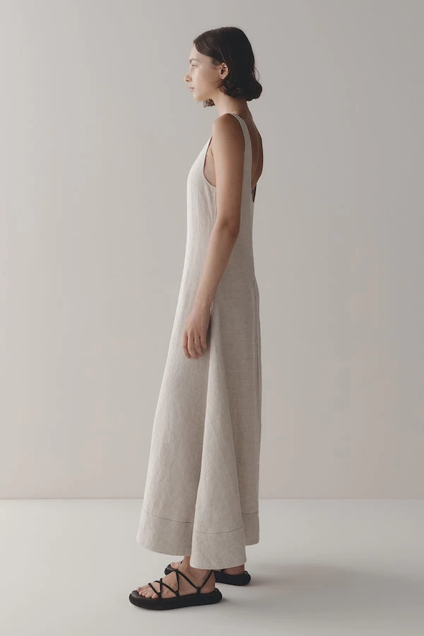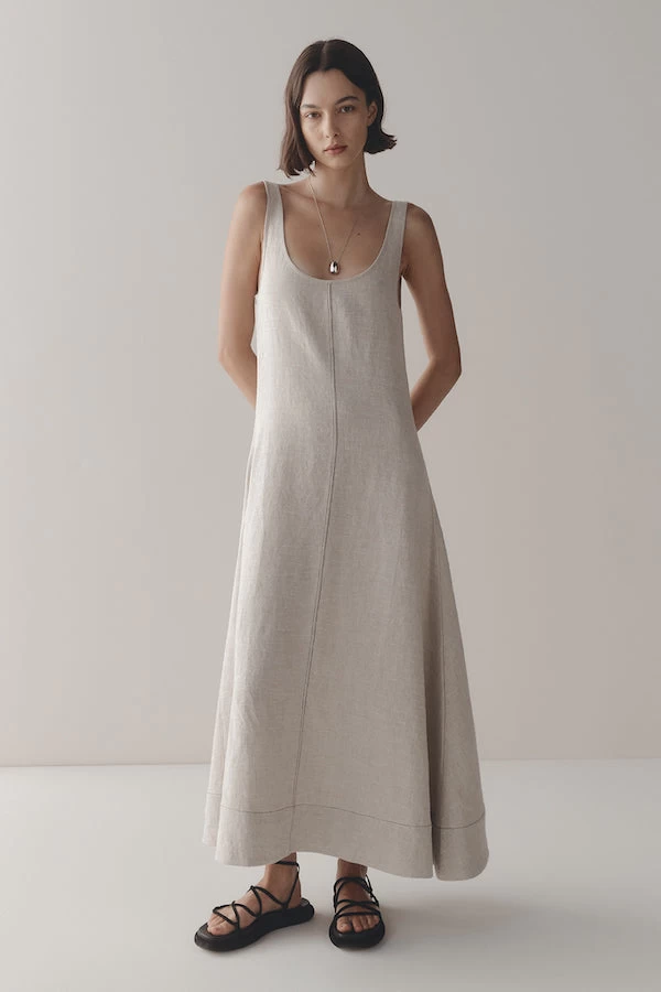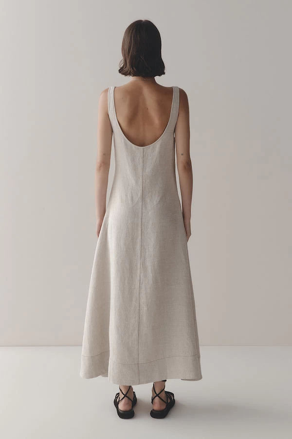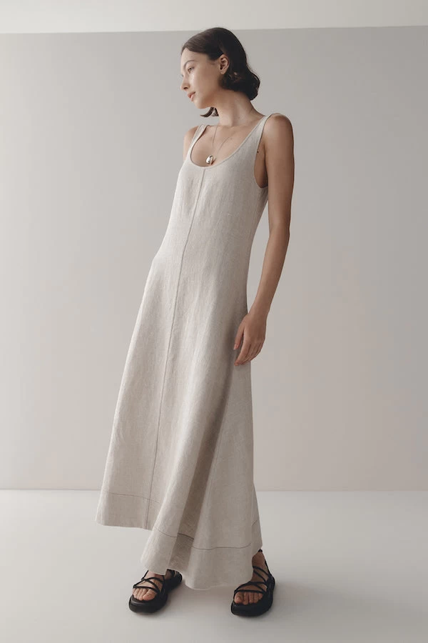 The Marle Emile Dress Riceย is an iteration of our adored Anouk dress. It features the same fitted silhouette through the waist and chest before falling into an A-line skirt through the bottom. This dress is crafted in a ramie / cotton cloth and features a soft round neckline, wide straps and is secured by an invisible zipper at the side. This dress is finished with a contrast stitch detailing through the middle and bottom hem.