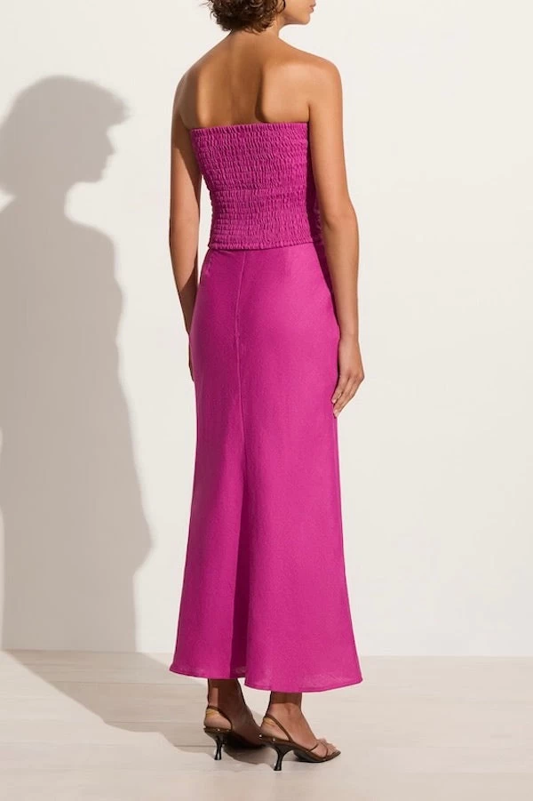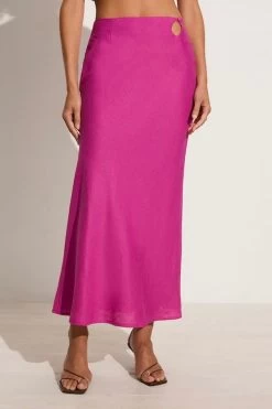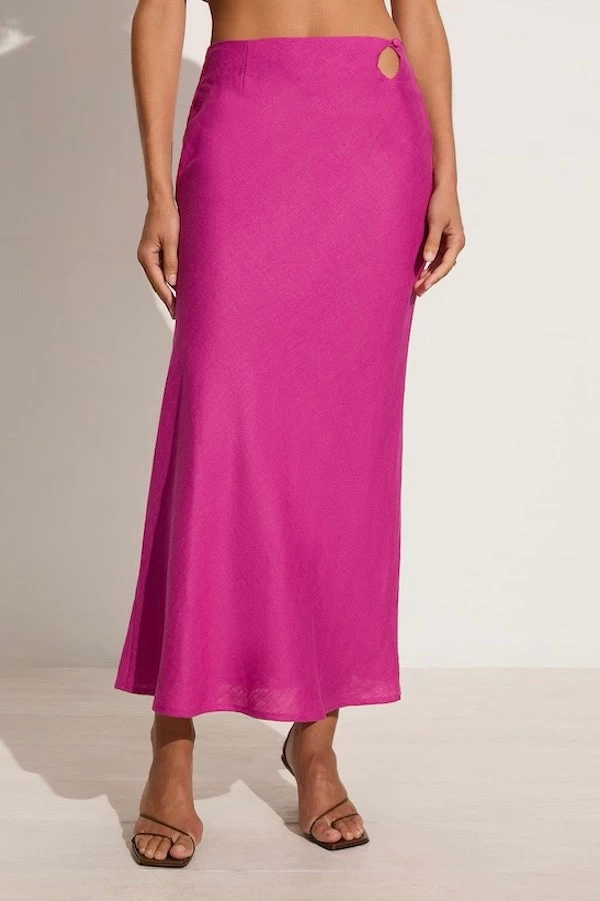 The Estina Skirt by Faithfull the Brand is a luxurious addition to any wardrobe. Crafted with a low-mid rise, bias cut silhouette, and sophisticated self-button detailing, this timeless piece offers a figure-flattering fit. An invisible zipper provides the perfect finishing touch. Perfect for any occasion, the Estina Skirt will make a stylish statement.