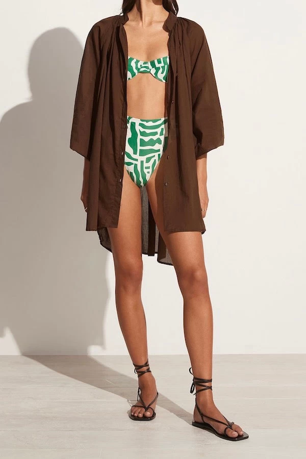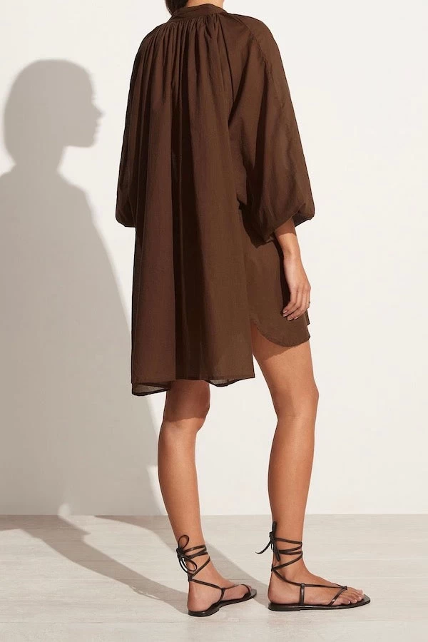 he Faithfull the Brand Lucita Smock Dress Chocolate is a mini smock dress crafted with lightweight cotton voile and hand-dyed in an oceanic Turquoise hue. An easy-wearing and relaxed silhouette with long voluminuous sleeves, a fabric-covered button front and a self-fabric tie detail at the waist for a custom fit. Wear this piece as a poolside cover up or pair it with your favourite sandals for effortless summertime styling.
