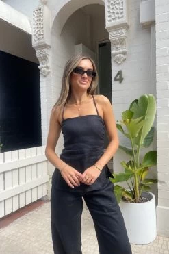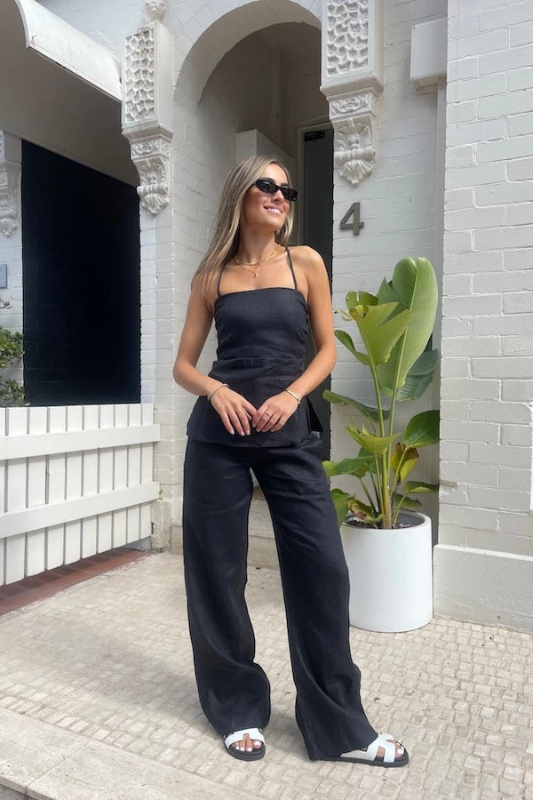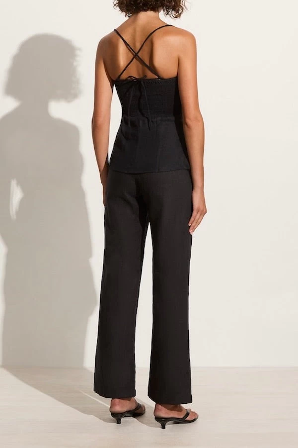 The Faithfull the Brand Marcelo Top is a tailored essential, cut from breathable linen and hand-dyed in staple Charcoal Grey. Designed for easy-wear and versatility, this top offers a square neckline, shirred back panel for comfort, peplum hem, side splits, and straps designed to be tied in multiple ways. Style it with the Vincente Pants and strap heels for a refined desk to dinner ensemble.