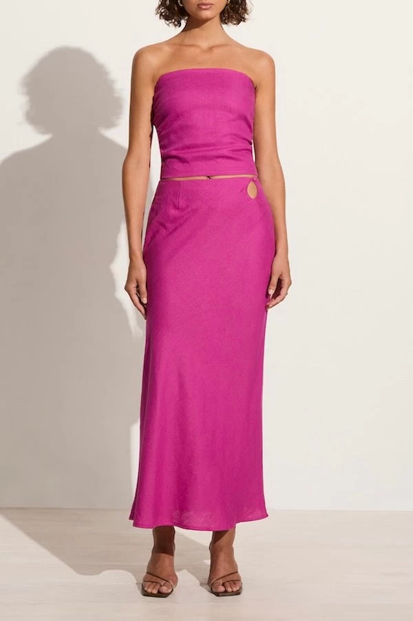 Add a pop of print to your wardrobe with the Faithfull the Brand Praiyah Bodice in Magenta. Designed for easy-wear, the Praiyah boasts a strapless neckline, gathered sides and a shirred back for extra comfort. Cut from responsibly sourced linen and artisanally hand-printed for a tie-dye effect, the Praiyah is an effortless sunshine staple that pairs with the Davina Bias Skirt for a matching set.