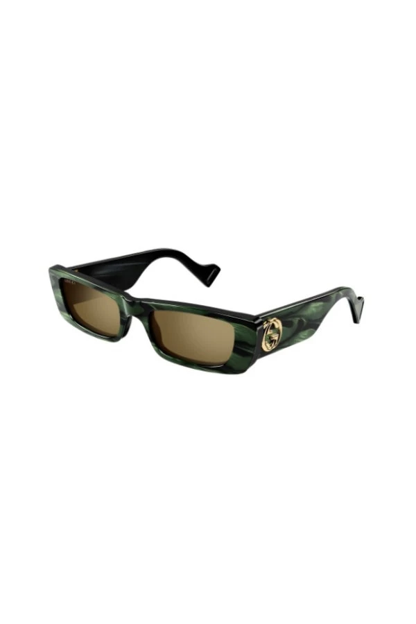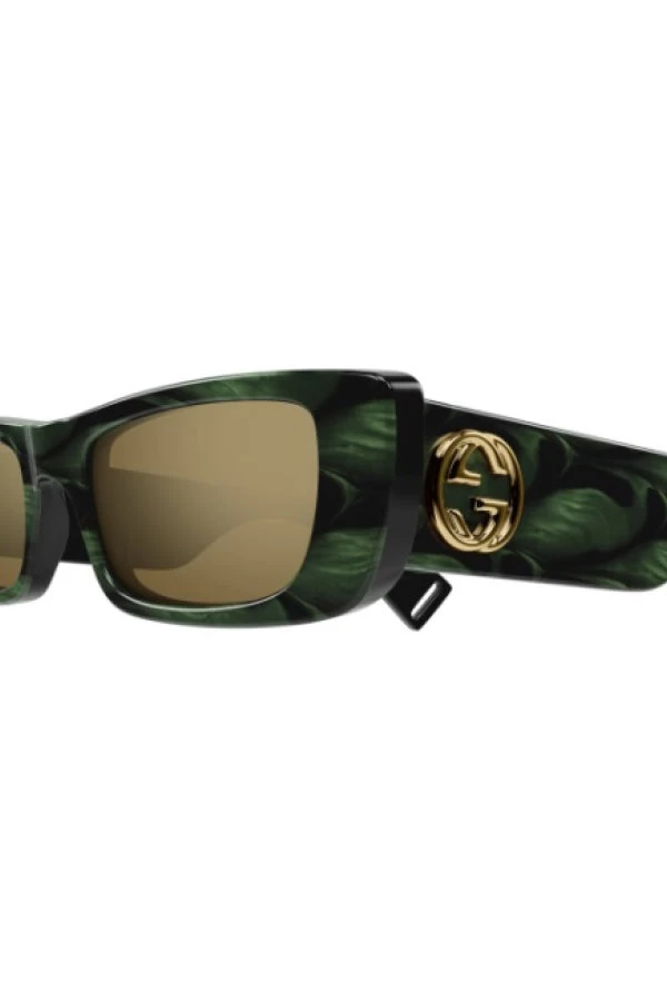Gucci vintage inspired extreme oval bold acetate shape. Giant Gold GG Interlocking logo in contrast with thick acetate temples ending with a perforeted end tip. Unisex rectangular narrow shape.