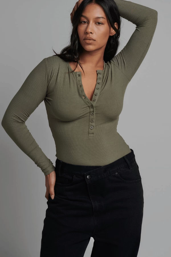 Introducing our minimalist-inspired bodysuit that effortlessly captures timeless beauty from Bayse. This versatile piece is destined to become your favorite wardrobe staple. Crafted with a ribbed fabric that offers a comfortable stretch, it features long sleeves and a high crew neckline for a sleek and elegant look. The button-down feature adds a touch of modernity to the classic silhouette, while the fitted design ensures a flattering fit. With snap fasteners at the crotch, it combines convenience and style seamlessly.