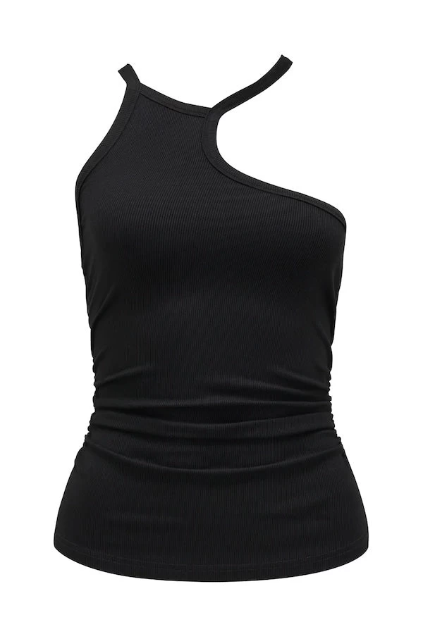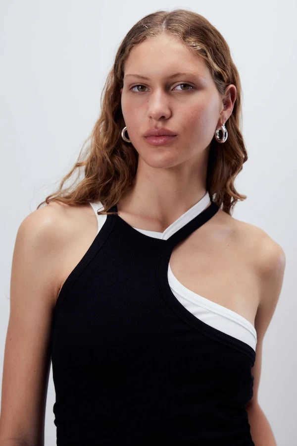 Asymmetrical ribbed tank by Misha features a scooped armhole and curved hem. Available in ivory and black for versatile styling.