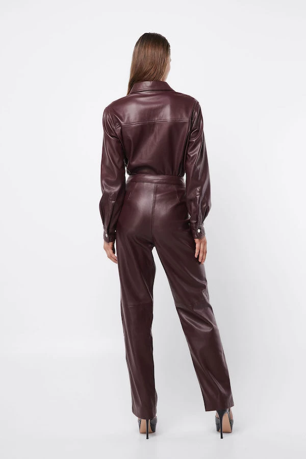 Featuring a deep burgundy hue and a faux leather fabrication, The Habitual Shirt Burgundy by Mossman is a unique and fashion forward design. The shirt sports a collared neckline, a press stud button through front and a relaxed silhouette. Style it with The Habitual Pant and a black boot for a powerful look.