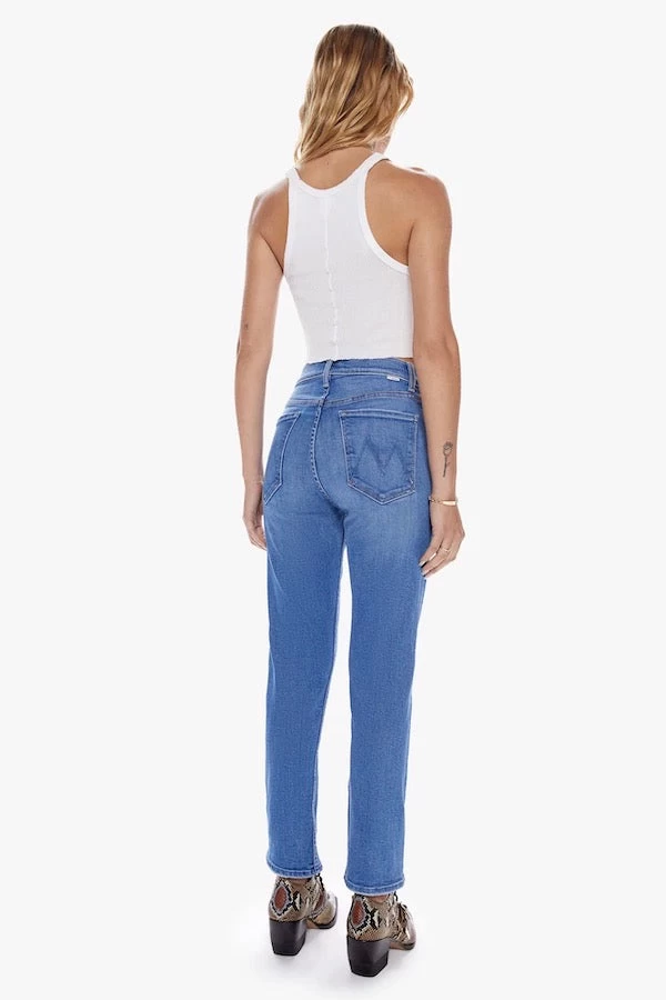 Our bestselling Mother Denim high-rise straight leg with a button fly and a cropped inseam. Made from denim with a touch of stretch, Layover is a bright mid-blue wash with whiskering and fading throughout. Pairs well with a spotty Wifi connection and airport snacks.
