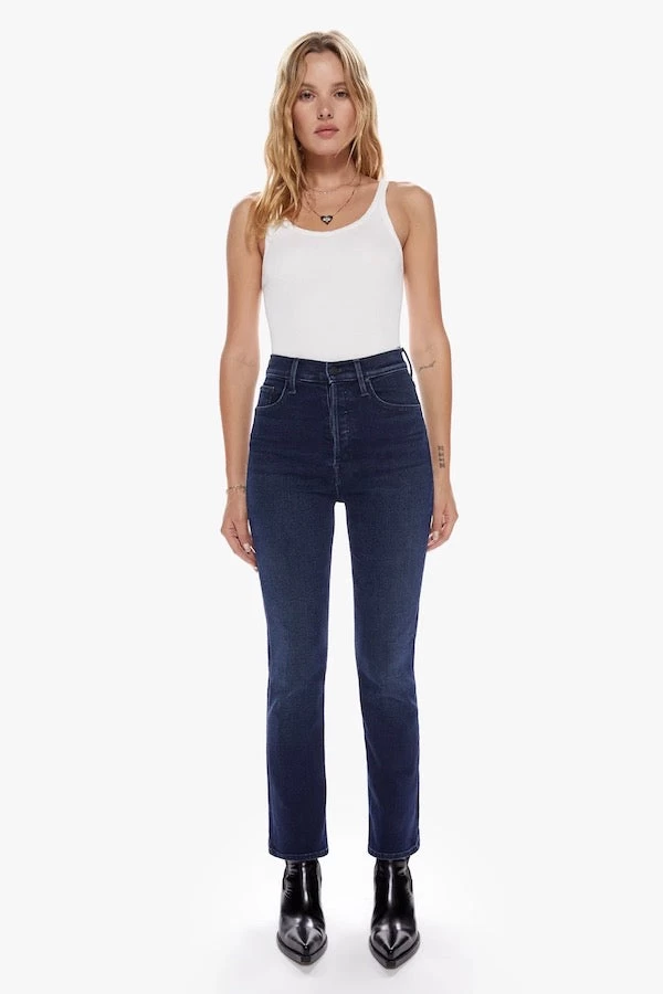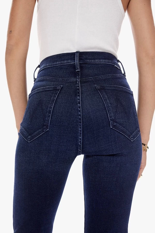 Eat my dust. Mother Denim ultra high-rise flare with a button fly and a clean ankle-length hem. Cut from comfortable stretch denim, Catch Me If You Can is a dark blue wash with tonal hardware.