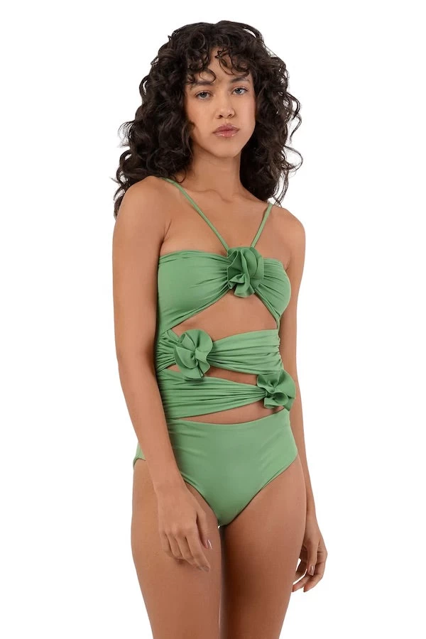 Maygel Coronel One-piece swimsuit with a straight neckline at the front and back, knot closure and asymmetrical openings on the abdomen with 3 flower-shaped ruffles. This suit has a higher rise in the leg that offers a sexier silhouette.