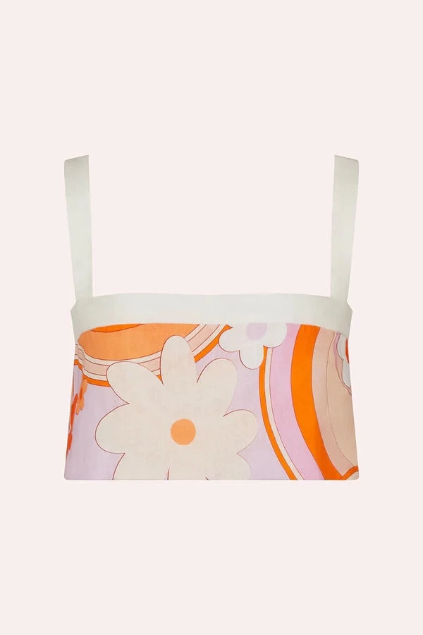 An airy and feminine cut designed by Cin Cin SWIM with sixties supermodels in mind. Step into the Flower Powered sixties with our tangerine and lilac hued Bloom print.Â