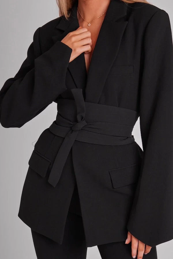 A modern take on tailoring, the blazer features contoured seams and padded shoulders to create a structured silhouette. Fully lined for a comfortable fit, the blazer is designed to be slightly oversized so we recommend sticking with your usual size. Featuring a single button fastening, sharp lapels and our signature pointed sleeves. Your ultimate muse blazer comes equip with 2 additional belts so can be worn multiple ways – she really is the perfect piece for your forever wardrobe. We love her styled with the Ultimate Muse Trousers in Black for the perfect powerful suit.