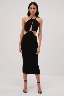 Make an entrance in the Zeke Slinky Midi Dress by Misha. Detailed with an asymmetric bodice, striking cutouts at the waist and a form-fitting silhouette, Zeke is available in Hydra Blue and Black.